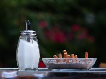 Keywords: sugar bowl sugar cigarette butts tilt smoking ashtray table cigarette end