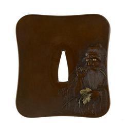 | Keywords: Sugiura Jôi - Tsuba with the Legendary Chinese ruler Shinnô - Walters 51369.jpg The Chinese sage Shinnô Ch Shen Nong Shen Nung is on the right side of the tsuba eating a blade of grass He has two small horns on his head Shinnô is credited with inventing the plow and the harp He also expanded the number of ideograms for the written language from eight to sixty-four On the reverse is a mountain landscape between 1701 1761 mid Edo copper gold sentoku cm 8 9 accession number 51 369 14451 Henry Walters Baltimore date and mode of acquisition unknown Walters Art Museum Henry Walters Acquired by Henry Walters Signature Issandô Jûi kao ; Seal Nagaharu place of origin Edo present-day Tokyo Japan Walters Art Museum license Tsuba in the Walters Art Museum Sugiura Jôi Media contributed by the Walters Art Museum needs category review Shennong |