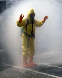 Keywords: suit decontamination protective chemical protection mask safety gas workwear hazardous hazmat worker training disaster wear