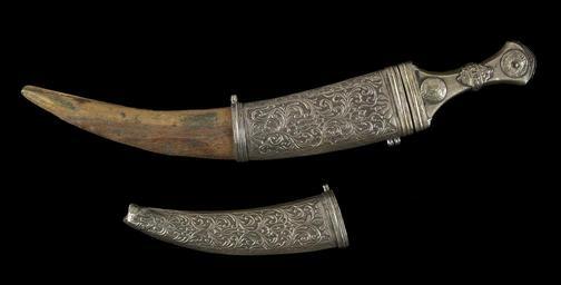 | Keywords: Sulayman Salih - Thuma - Walters 511451 (2) (3).jpg The sheath is created from two pieces each with a buckle at the end and several loops on the side and back for attaching it to the girdle The front of the sheath is decorated with an arabesque leaves and tendril pattern The blade is fixed in the wooden handle with two pins which end in round decorative plaques made from coins Between the two plaques is a rhombic-shaped element on a band which closes at the back The back of both parts of the sheath have each an Arabic stamp with the date nusfi 1267; nusfi means half This date belongs either to the reign of al-Mutawakkil Ali AH 1267 or al-Mansur Ahmad AH 1266-1267 An engraved Hebrew inscription names the silversmith Sulayman Salih mahasit The term mahasit means half 1267 AH/AD 1850-1851 silver with gilding and wood Overall L 22 1/16 x W 16 1/8 in 56 x 41 cm ; L of blade 11 x W of blade 18 7/8 in 28 x 48 cm accession number 51 1451 80932 Mr Benjamin Zucker Zucker Family Trust and Mr Derek Content New York and London by purchase Walters Art Museum Joint gift to the Walters Art Museum Baltimore and the Israel Museum Jerusalem by Mr Benjamin Zucker and Mr Derek Content in honor of Mrs Barbara Zucker and Mrs Amanda Content 2010 Stamp Arabic nusfi 1267 Engraving Hebrew Sulayman Salih mahasit place of origin between Taizz and Sana'a <gallery> File Sulayman Salih - Thuma - Walters 511451 jpg File Sulayman Salih - Thuma - Walters 511451 2 jpg </gallery> Walters Art Museum license Weapons in the Walters Art Museum South Arabian art in the Walters Art Museum Sulayman Salih Media contributed by the Walters Art Museum needs category review |