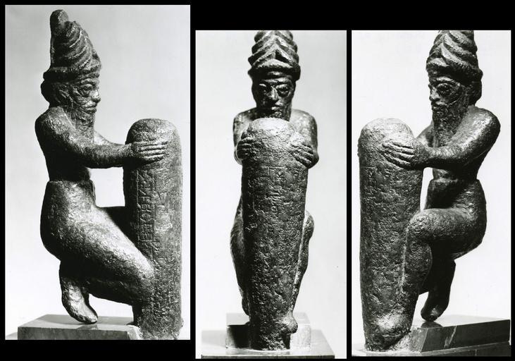 | Keywords: Sumerian - Deity Holding a Foundation Peg - Walters 54790 - View A.jpg A deity wearing a divine horned headdress kneels with a foundation peg inscribed with King Gudea's name Though the inscription is mostly defaced it was probably dedicated to the Ningirsu god of the city of Lagash ca 2100 BC Neo-Sumerian cast bronze cm 17 7 4 3 7 2 accession number 54 790 7006 Joseph Brummer New York Henry Walters city Baltimore Walters Art Museum Henry Walters Acquired by Henry Walters 1923 Inscription includes name of King Gudea place of origin Imgur-Enlil present-day Balawat Iraq Walters Art Museum license Ancient Near East art in the Walters Art Museum Art of Sumer Media contributed by the Walters Art Museum needs category review |