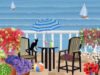 Keywords: summer balcony chairs ocean relaxation rest tranquility calm sea parasol umbrella ball plants flowers sailboats cat black blue