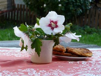 Keywords: summer countryside lunch steak cuttings hibiscus table table-cloth vase outdoors still life brunch white