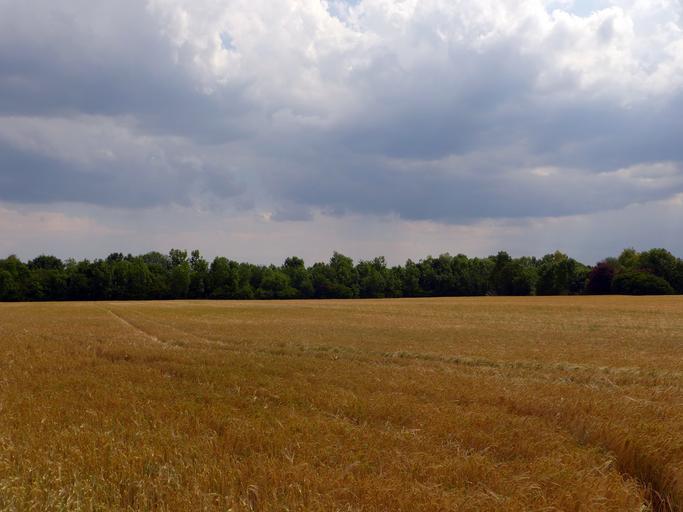 Keywords: summer field cereals cornfield clouds landscape plant spike agriculture harvest cloud mood yellow green storm clouds nature sky trees edge of field harvest time flora arable gewitterstimmung weather