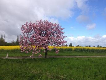 Keywords: summer fields yellow fields pink flowers pink tree road spring countryside