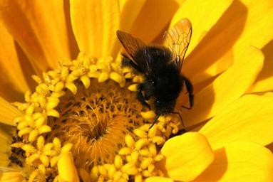 Keywords: summer flower yellow flower blossom bloom bright gerbera flora nature yellow flower late summer flower hummel black nectar beautiful sun pollen bloom golden yellow insect petals decorative collect nectar