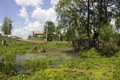 Keywords: summer swamp village trees birch street house