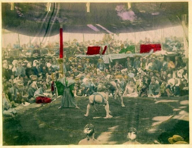 Keywords: Sumo match 1890s.jpg Two japanese sumo wrestlers waiting for the initial charge with a young boy acting as referee Hand-colored albumen photograph by unknown photographer 1890s Black and white photographs of sumo PD-Art Artworks missing infobox template |