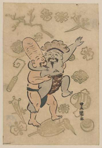 Keywords: Sumo match between Daikoku and Fukurokuju..tif Artwork Creator Utagawa Toyokuni II Print shows the Buddhist gods Daikoku and Fukurokuju two of the seven lucky gods of Japan as sumo wrestlers 1831 Woodcut colour Size cm 12 8 18 9 Institution Library of Congress object history exhibition history credit line jpd 00271 accession number PD-old-auto-1923 1835 Utagawa Toyokuni II Parodies of sumo Daikokuten Fukurokuju |