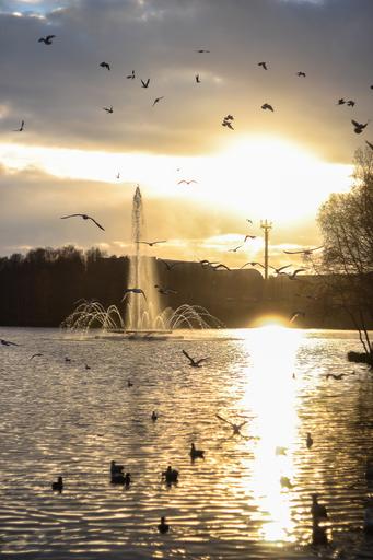 Keywords: sun birds bird sunset lake fountain water nature light landscape