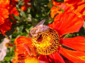 Keywords: sun brews helenium bee honey bee fiesta dark splendor flowers insect garden flowers red orange bloom plant close nature macro