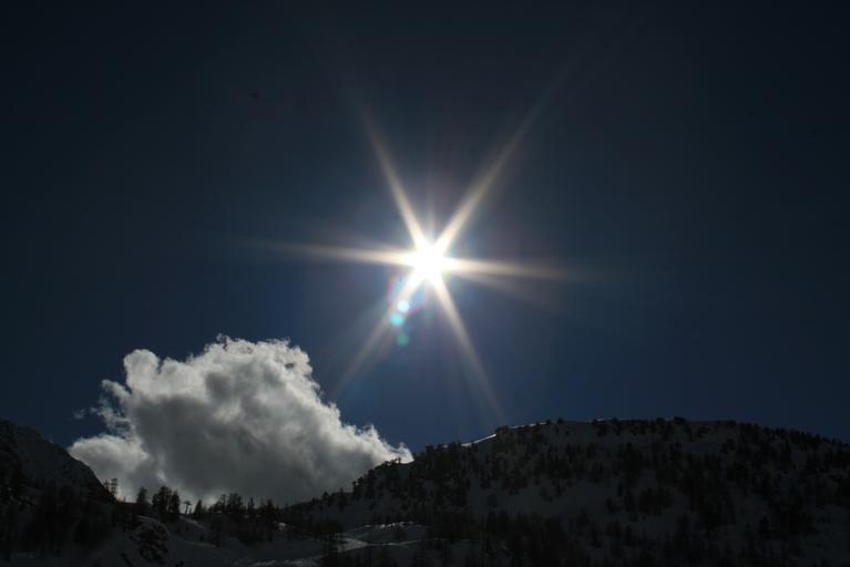 Keywords: sun clouds against the light mountains landscape sky dark rays
