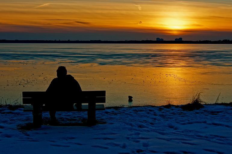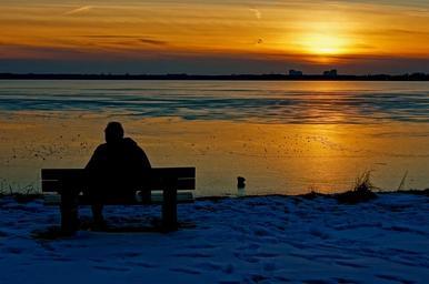 Keywords: sun clouds evening human alone romance romantic lake water ice winter horizon
