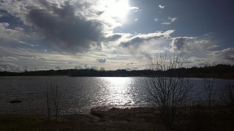 Keywords: sun clouds sunset sky blue blue sky spring branches tree sunshine finnish lake water beach beautiful horizon twilight in the evening scenic silence dark clouds cloud dark windy distant