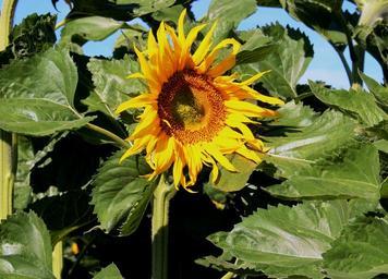 Keywords: sun flower sunflower field detail leaves gloss close sunlight sky blue