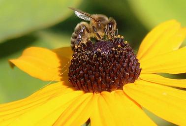 Keywords: sun hat bee nectar flower blossom bloom yellow brown close
