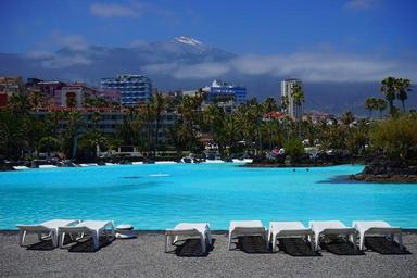 Keywords: sun loungers swimming pool city puerto de la cruz skyscrapers pico del teide teide sea water swimming pool lago martiánez tenerife canary islands pool swim blue water refresh outdoor pool fun bathing berth clear cool wet berths free