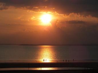 Keywords: sun set sun setting beach sea horizon clouds glow orange sunbeam reflection
