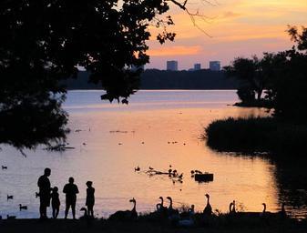 Keywords: sundown lake family silhouette water dusk horizon sunset peaceful serene vivid panorama urban skyline vibrant orange evening sky blue beautiful sun twilight dallas texas white rock lake