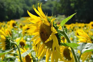 Keywords: sunflower big flower field of sunflowers petals leaves yellow
