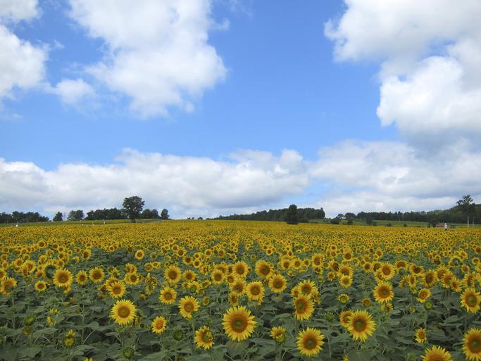 Keywords: sunflowers field blooming agriculture sky clouds farm growth farming rural outdoors outdoor scenery environment garden yellow harvest crop countryside flower
