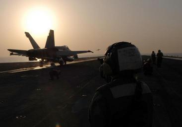 | Keywords: Sunrise activity aboard USS John C. Stennis DVIDS103217.jpg en An F/A-18C Hornet from the Death Rattlers of Marine Strike Fighter Squadron 323 launches off the flight deck of Nimitz-class aircraft carrier USS John C Stennis Stennis and Carrier Air Wing 9 are on a scheduled deployment in support of the global war on terrorism and maritime operations Maritime operations help set the conditions for security and stability in the maritime environment as well as complement counter-terrorism and security efforts of regional nations 2007-06-23 https //www dvidshub net/image/103217 070615-N-+++++-341 2008-07-16 05 08 USS JOHN C STENNIS AT SEA PD-USGov-Military-Navy F/A-18C Hornet Images from DoD uploaded by Fæ |