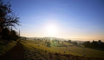Keywords: sunrise überlingen lake constance alpine holiday europe yellow sunny lake autumn green branches sun fog tree morning sky