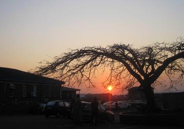 Keywords: sunrise dawn early morning umbrella shaped tree pink glow buildings outlined silhouette