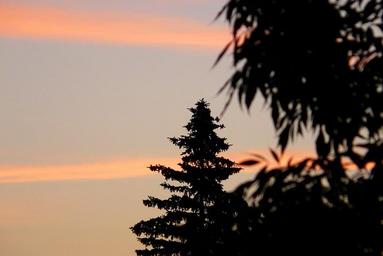 Keywords: sunrise dawn sky clouds tree spruce contrast foliage shadow streaks twilight