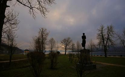 Keywords: sunrise landscape park trees morgenstimmung nature sun light fog clouds skies morgenrot water mountains still mood hedges statue sky