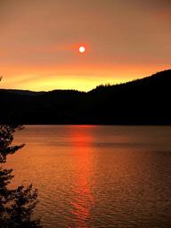 Keywords: sunrise landscape scenic lake morning water nature sun reflection weather glowing red colorful canim lake british columbia canada