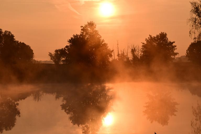 Keywords: sunrise morgenrot skies sun sky dawn light nature mood mirroring lake trees fog beautiful romantic mourning farewell melancholy