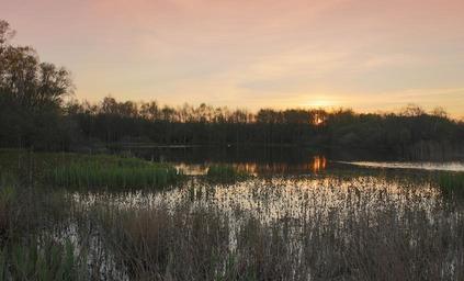 Keywords: sunrise morning orange sky view denmark natural landscape viborg water edge wetland clouds silence spring ro water lake trees forest wood siv