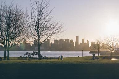 Keywords: sunrise park grass benches trees lake water skyline buildings towers architecture sky
