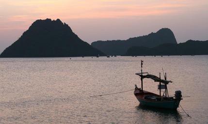 Keywords: sunrise peaceful serene harbor cove boat fishing boat water thailand dawn bay