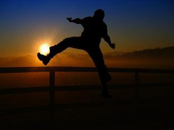 Keywords: sunrise sunset man human person football kick shot hits morning orange dark sky sun landscape fence silhouette jump joy lust for life pleasure