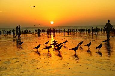 Keywords: sunset beautiful beach seashore crowd crows sky gold bright colorful low tide people birds shore coast ocean evening