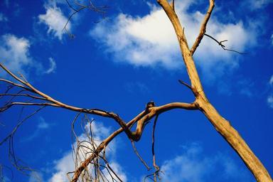 Keywords: sunset branches trunk bare golden light glowing birdie very blue sky