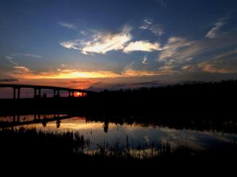 Keywords: sunset bridge sun water reflection red in the evening