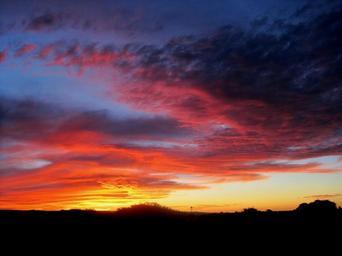 Keywords: sunset clouds flocked reds dark crimson orange vermillion yellow layered horizon sky