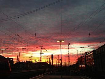 Keywords: sunset clouds railway station train red reddish purple evening mood twilight atmosphere abendstimmung