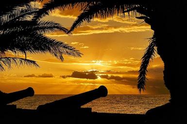 Keywords: sunset crepuscular rays ocean cannons silhouettes palm trees light clouds seascape sea twilight palms dusk sky fort
