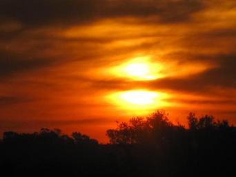 Keywords: sunset dramatic sun split white yellow bright light sky clouds orange red glow shadows trees
