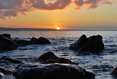 Keywords: sunset dusk ocean sea rocks boulders clouds water horizon sky