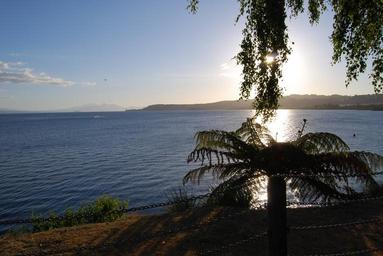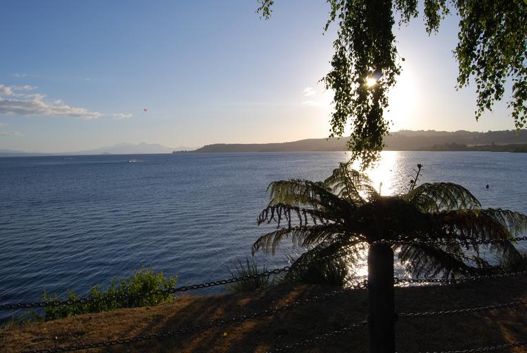 Keywords: sunset dusk palm tree shoreline lake water new zealand