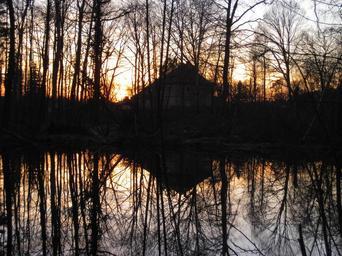 Keywords: sunset evening lake mirroring home forest landscape silhouette dusk sunlight abendstimmung
