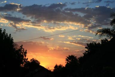 Keywords: sunset glowing orange yellow clouds loose edged bright light sky tree outline