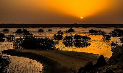 Keywords: sunset horizon orb water reflection landscape panorama outdoors dusk evening orange sky scenic