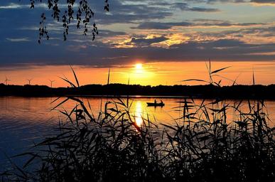 Keywords: sunset lake abendstimmung nature romance sun landscape reed kahn atmospheric grasses water waters romantic boot rowing boat