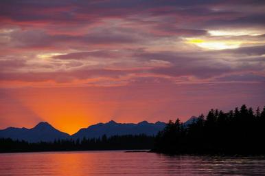 Keywords: sunset lake mountains twilight dusk sky trees reflection clouds horizon calm peaceful orange scenic scenery outdoors water